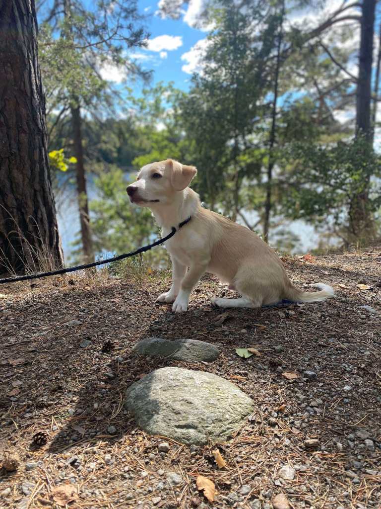 Han går fint i koppel, men kan ibland bli lite dragig- det finns ju så mycket annat som lockar i naturen! Albin åker gärna bil. Tåg och buss har han aldrig åkt.