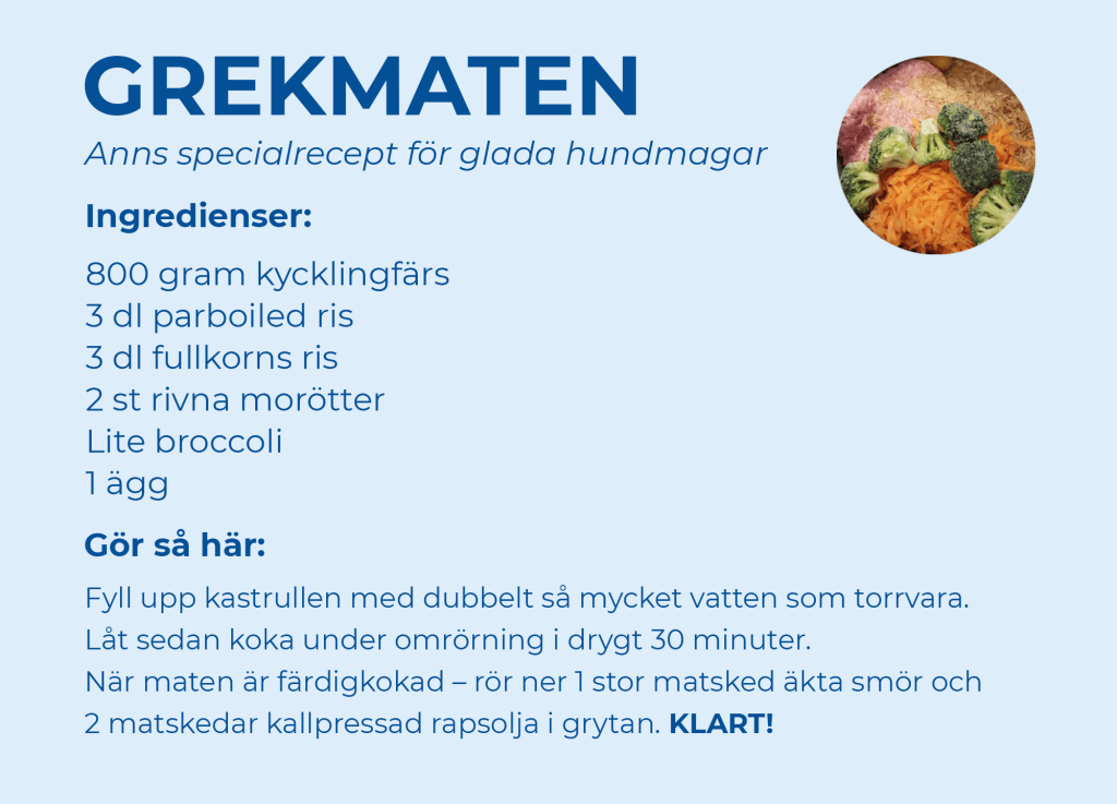 Det är vanligt att hunden är lite orolig i magen när den just kommit till Sverige. När den bodde i Grekland har den ätit det allra billigaste fodret som oftast inte är av någon bra kvalitet, och nu plötsligt ska hunden vänja sig vid sin nya mer exklusiva mat som är anpassad efter ålder, storlek, aktivitet och behov – och det kan ibland vara lite jobbigt för magen. Vi har ett recept kallat ”grekmaten” som man om man vill kan ge till hunden den första tiden efter hemkomst. Receptet är snällt mot magen och efter ett par dagar kan man försiktigt börja att blanda i det foder du har för avsikt att ge din hund framöver. Då hinner magen vänja sig vid den nya maten i lugn och ro. Receptet hittar du nedan. Vill du inte ge grekmaten rekommenderar vi att man blandar i lite kokt ris i hundens torrfoder första tiden för att hjälpa magen att stabilisera sig.