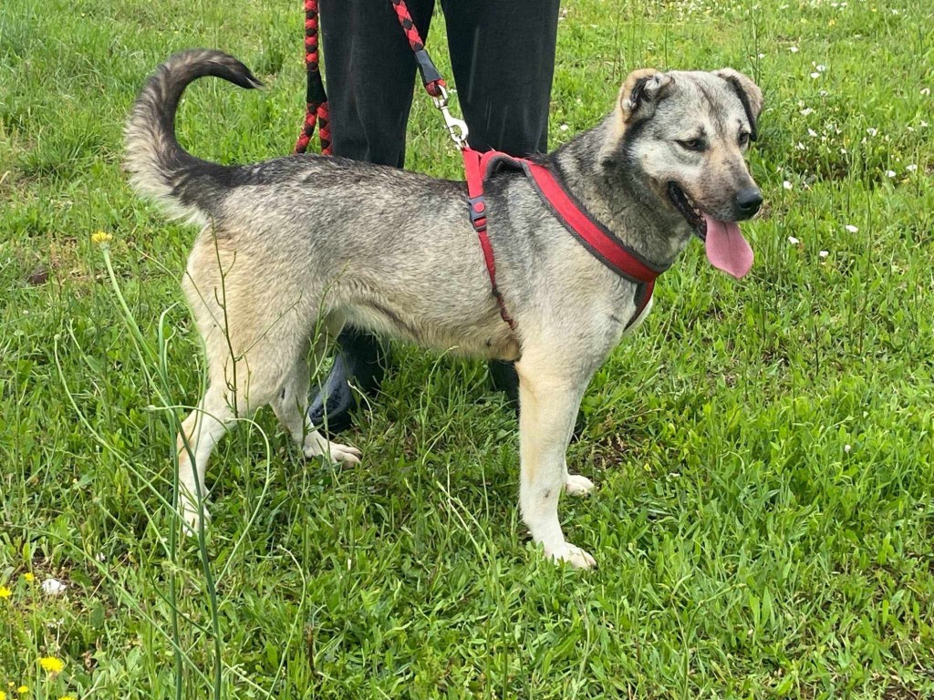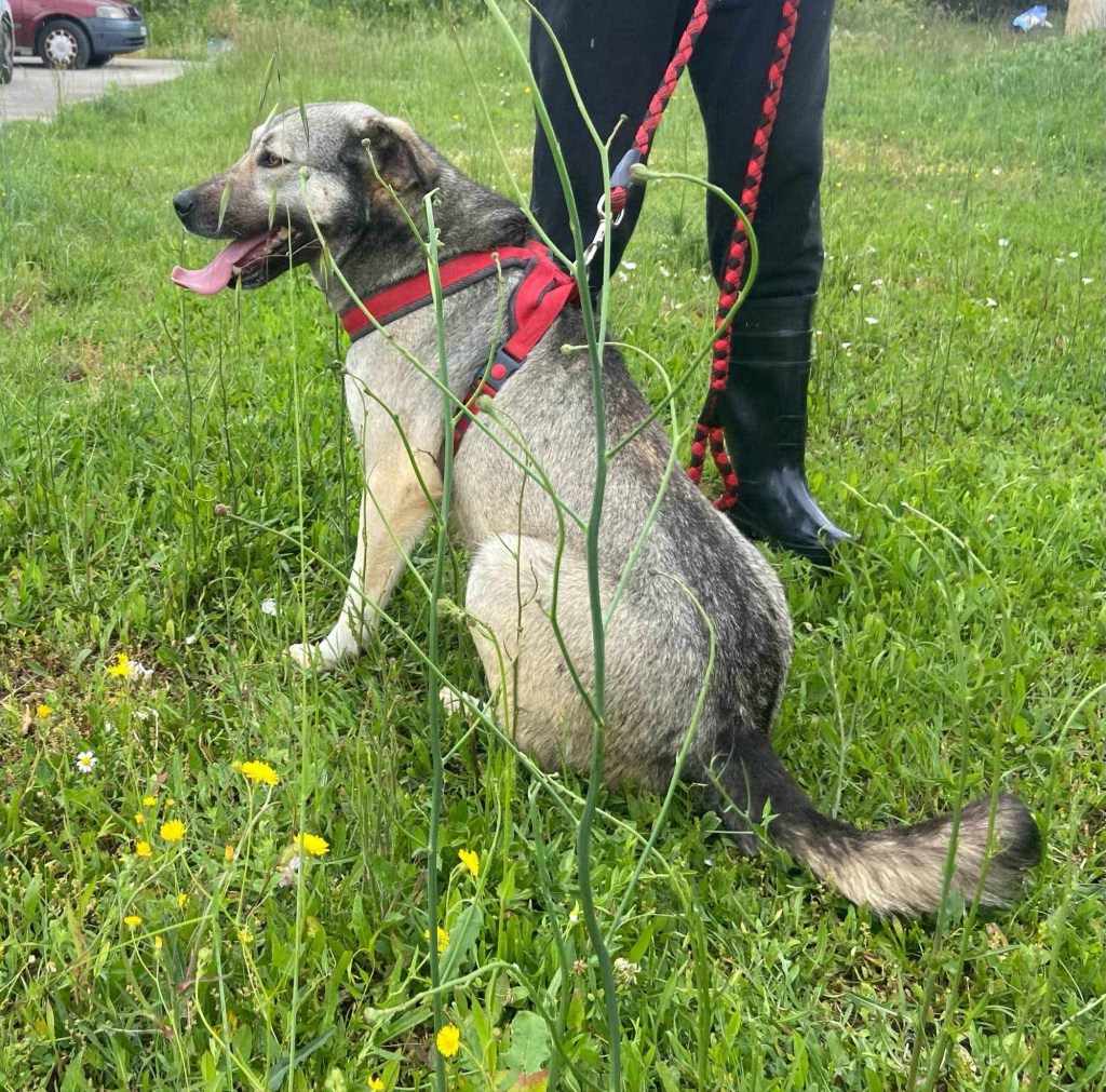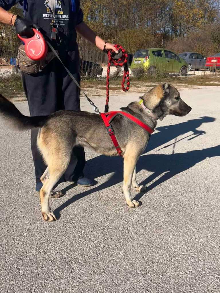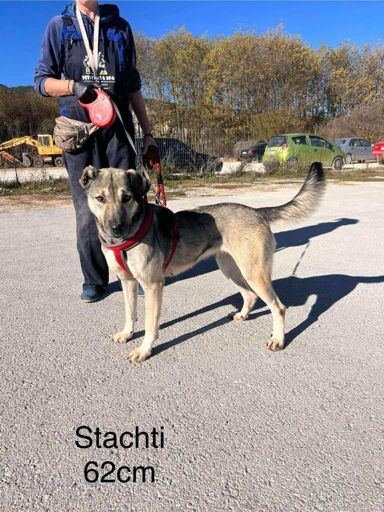 Stachty är social och vänlig mot alla hon möter- även främlingar. Hon är en lojal och mysig tjej, som gillar att bli kelad med. Hon är dessutom en riktigt vacker tjej av modell lite större. När hon hittades hade hennes ena öra kapats. Tyvärr är det vanligt att det görs i Grekland, då man tror att hunden ska höra bättre och då kunna vakta bättre. ![]()